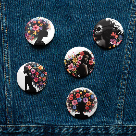 Set of Pin Buttons, Black Girl Curls & Flower Graphic