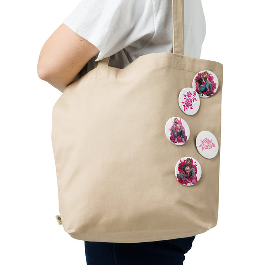 Set of Pin Buttons, Pink Roses Young Women Graphics