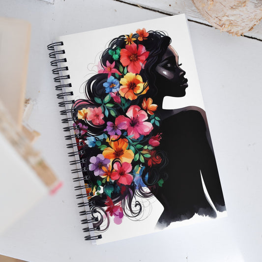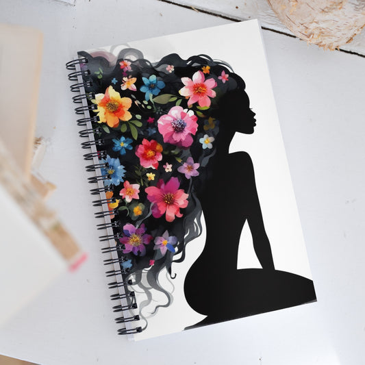 Journal Notebook Spiral Metal Binding, 140 Dotted Pages Soft Cover, Flowers Curls Black Girl Graphic