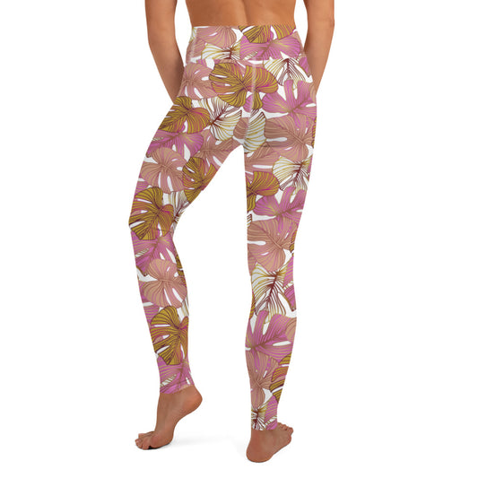 Women's Workout Yoga Leggings, Pink Tropical Plant Printed Pattern