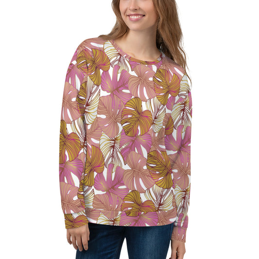 Women's Pullover Soft Fleece Crewneck Sweatshirt, Pink Tropical Plant Printed Pattern